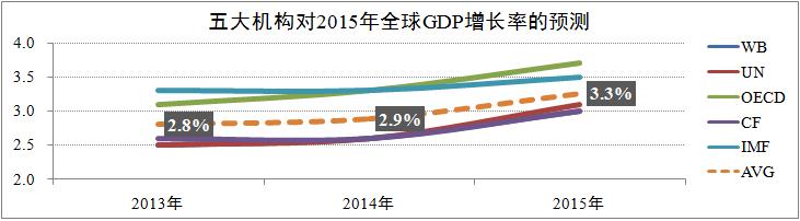 發稿時間:2015-04-11根據世界銀行(World Bank)、聯合國(United Nations)、經濟合作與發展組織(OECD)、英國共識公司(Consensus Forecasts)及國際貨幣基金組織(IMF)等五大國際權威機構的預測,2015年全球經濟形勢整體好于2014年,下半年全球經濟增速將會有較為顯著的回升,其中主要得益于全球貿易的逐步增長、通貨膨脹及失業率的繼續走低,預計全年全球GDP加權平均增速為3.3%,較2014年提升0.4個百分點。