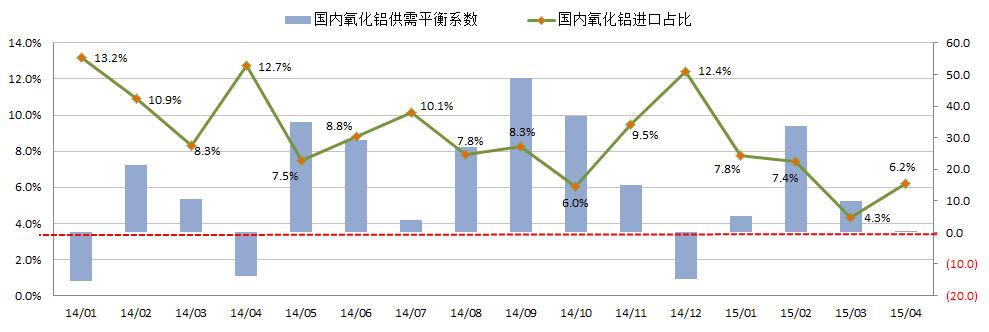 圖3:我國氧化鋁供需平衡系數及國內氧化鋁進口占比變動圖