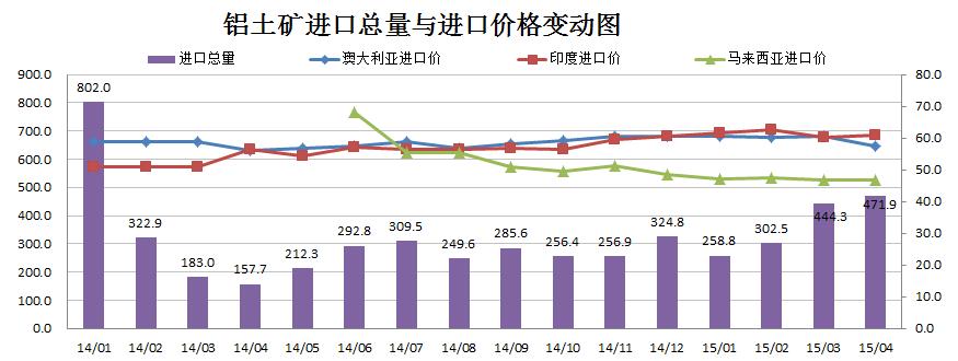 鋁土礦進口價格或持續穩中有降態勢。近兩個月我國的鋁土礦進口量都維持在較高的水平。監控數據顯示,2015年4月份我國鋁土礦進口量猛然上漲至471.9噸,同比增長199.2%,環比增長6.2%。其中,澳大利亞、印度和馬來西亞為主要的進口國,其進口量占比高達93.6%,進口價格保持穩定并略有下降。預計鋁土礦進口價格將保持穩中有降趨勢,但下降幅度不會很大。