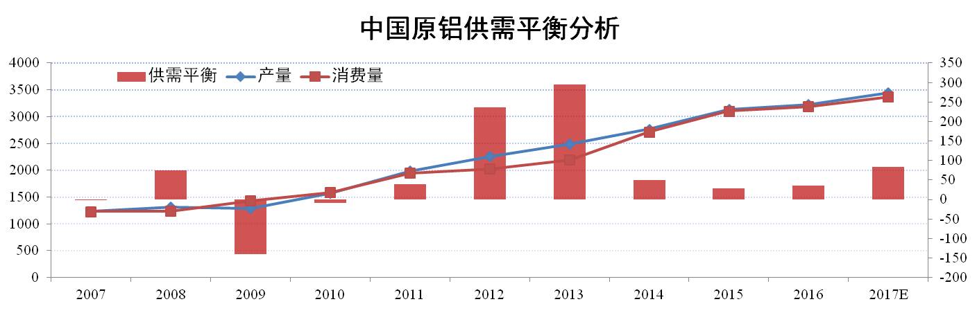國內(nèi)原鋁供需方面:2017年,預計新增需求量在150萬噸左右,總需求量在3367萬噸左右;新增供給量在195萬噸左右,總供給量在3450萬噸左右,整體來看,2017年國內(nèi)原鋁供需方面在過剩約80萬噸。