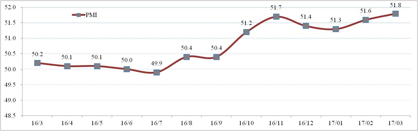 國(guó)家統(tǒng)計(jì)局?jǐn)?shù)據(jù)顯示,2017年3月份制造業(yè)采購(gòu)經(jīng)理指數(shù)PMI為51.8%,連續(xù)兩月上升。其中,生產(chǎn)指數(shù)和新訂單指數(shù)為54.2%和53.3%,分別比上月上升0.5和0.3個(gè)百分點(diǎn)。在生產(chǎn)和需求增速回暖的同時(shí)企業(yè)采購(gòu)力度加大,采購(gòu)量指數(shù)為53.4%,高于上月2.0個(gè)百分點(diǎn)。