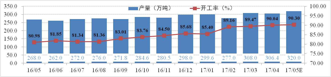 分析認為:供給側改革政策已經(jīng)落地,短期內(nèi)仍難以改變供需格局,因此市場供應仍將保持在高位。預期5月產(chǎn)量320萬噸,日化產(chǎn)量10.32萬噸,供應持續(xù)增加。