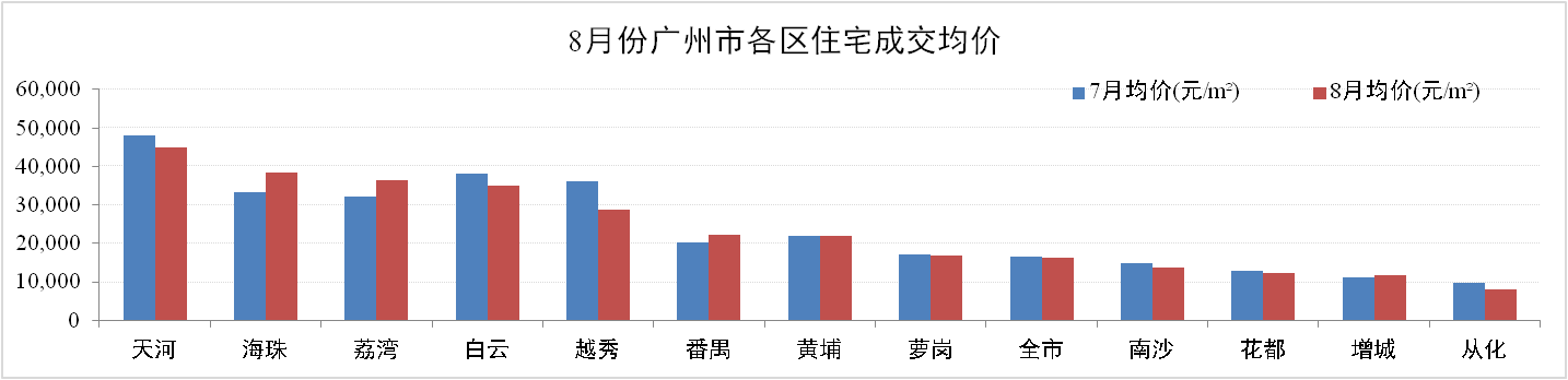 成交價方面:8月份廣州一手住宅成交均價16,313元/m2,環(huán)比下跌1.99%。其中,增城成交均價為11,617元/m2,環(huán)比上升3.03%。除海珠、荔灣、番禺及增城保持增長外,其他區(qū)域成交均價均錄得不同程度下跌,其中越秀跌幅達20.63%。