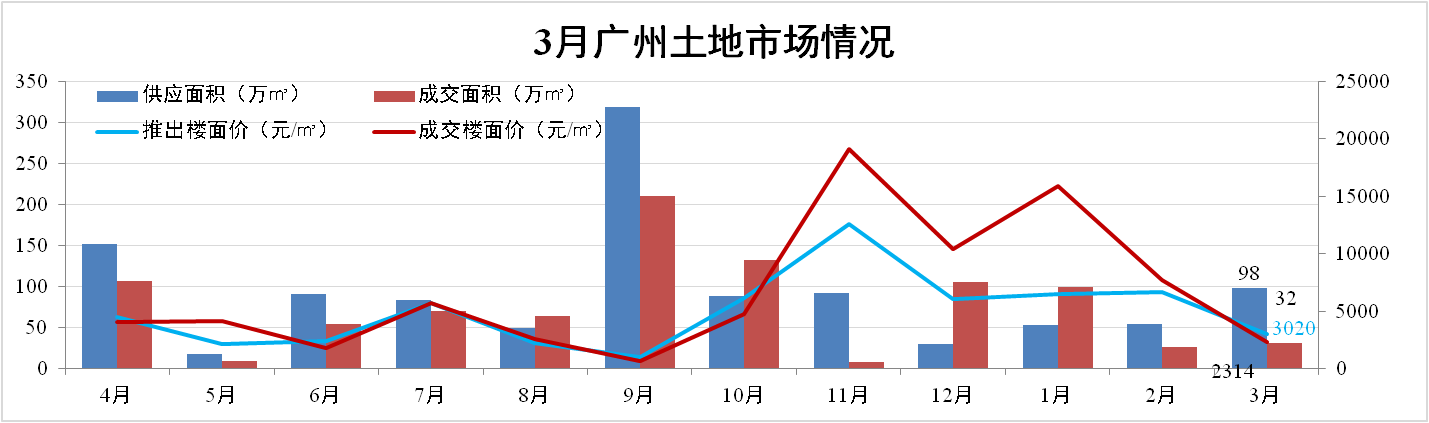 3月廣州市共推出10宗地塊,共有6宗成交。其中推出面積總額為98萬㎡,成交32萬㎡ ,推出樓面價3,020元/㎡,成交樓面價2,314元/㎡。