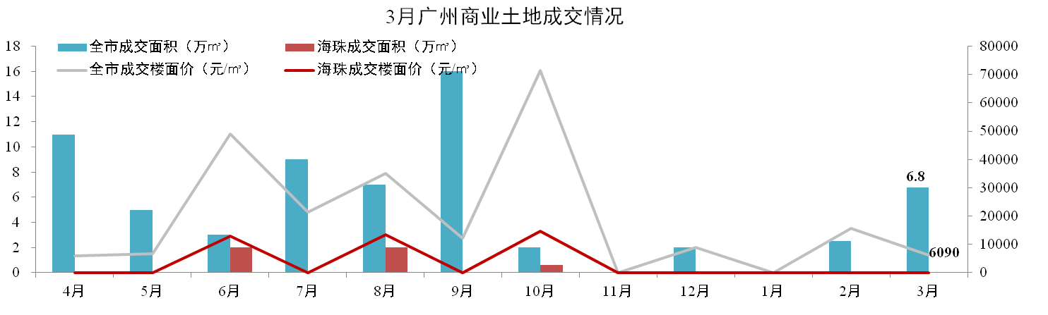 全市:3月共成交3宗商業地塊,成交面積6.8萬㎡,成交樓面價6,090元/m2,琶洲區域暫無土地成交。