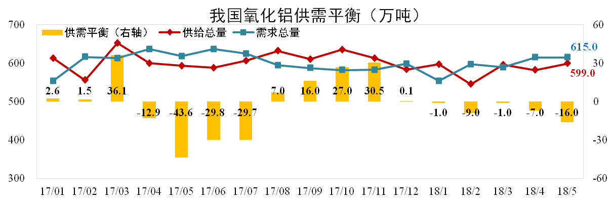 截至5月底,我國氧化鋁建成產能8167萬噸,運行產能7297萬噸,開工率89.35%,環比上升1.17個百分點。其中國內氧化鋁產量607萬噸,進口氧化鋁8萬噸,供給總量599萬噸,測算的需求量為615萬噸,理論短缺16萬噸。