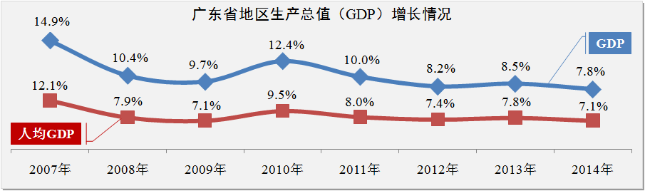 廣東經(jīng)濟(jì)方面。2014年廣東實(shí)現(xiàn)地區(qū)生產(chǎn)總值6.8萬億,全國占比10.7%,同比增長7.8%,較全國增速多0.4個(gè)百分點(diǎn)。其中第一產(chǎn)業(yè)增長3.3%,第二產(chǎn)業(yè)增長7.7%,第三產(chǎn)業(yè)增長8.2%。人均GDP方面,全年人均GDP同比增長7.1%,絕對收入首次超過1萬美元。總體而言,2014年全省經(jīng)濟(jì)運(yùn)行雖有所回落,但運(yùn)行基調(diào)基本平穩(wěn)。