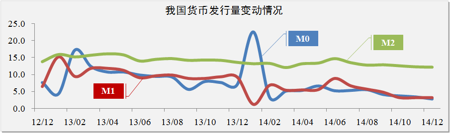 貨幣市場方面。2014年度我國M1的回落速度明顯高于M2的回落速度,表明銀行的定期存款增加,市場交易活力下降。綜合分析近年來我國貨幣發(fā)行量,2014年度貨幣發(fā)行量同比減少35%,但由于我國基礎(chǔ)貨幣流向存在不均衡特點(diǎn),穩(wěn)健的貨幣政策在抑制投資過熱的同時(shí),也加劇了部分行業(yè)市場出現(xiàn)通貨緊縮的風(fēng)險(xiǎn)。研究認(rèn)為,2015年央行將在穩(wěn)健的基礎(chǔ)上進(jìn)一步強(qiáng)化定向?qū)捤韶泿耪撸⒃阢y行業(yè)以及制造業(yè)方面會(huì)有所寬松舉措。