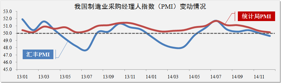 制造業(yè)方面。2014年末我國制造業(yè)采購經(jīng)理指數(shù)(PMI)下跌至50.1%,逼近50%的臨界點(diǎn)。匯豐PMI跌至49.6%,較統(tǒng)計(jì)局發(fā)布PMI低0.5個(gè)百分點(diǎn),我國中小企業(yè)的發(fā)展速度明顯放緩。12月份PMI數(shù)據(jù)回落至臨界點(diǎn)具有季節(jié)性因素影響,但從全年變動(dòng)趨勢上看,PMI及匯豐PMI的持續(xù)下滑說明我國制造業(yè)發(fā)展所面臨的壓力正不斷地?cái)U(kuò)大和增強(qiáng)。
